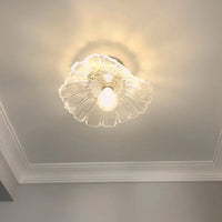 This exquisite flower-inspired light fixture features delicate clear glass petals paired with vintage brass accents. It adds timeless elegance and a soft ambient glow to any sophisticated interior space.